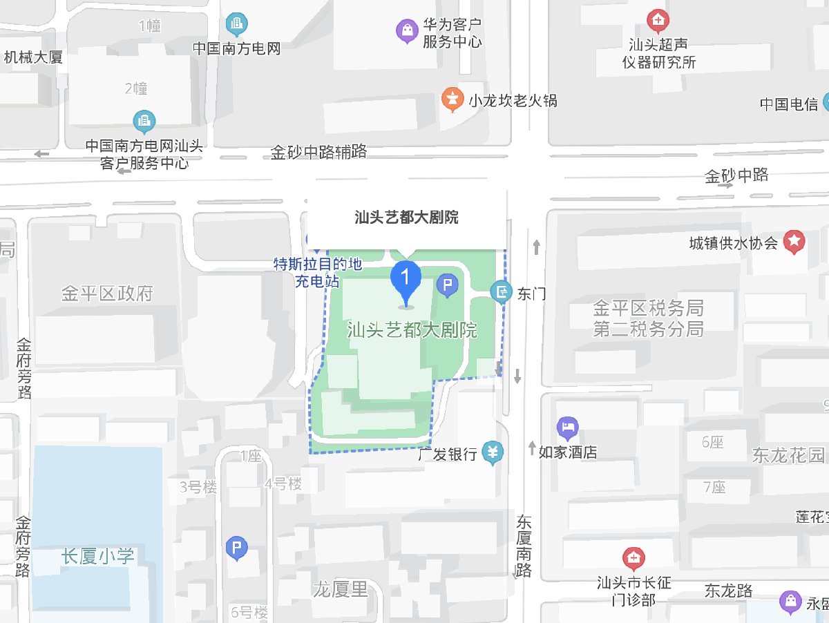 自驾出行驾驶到金砂中路进入辅道,在汕头国际大酒店旁。(可直接在导航app中输入“汕头市艺都大剧院”)