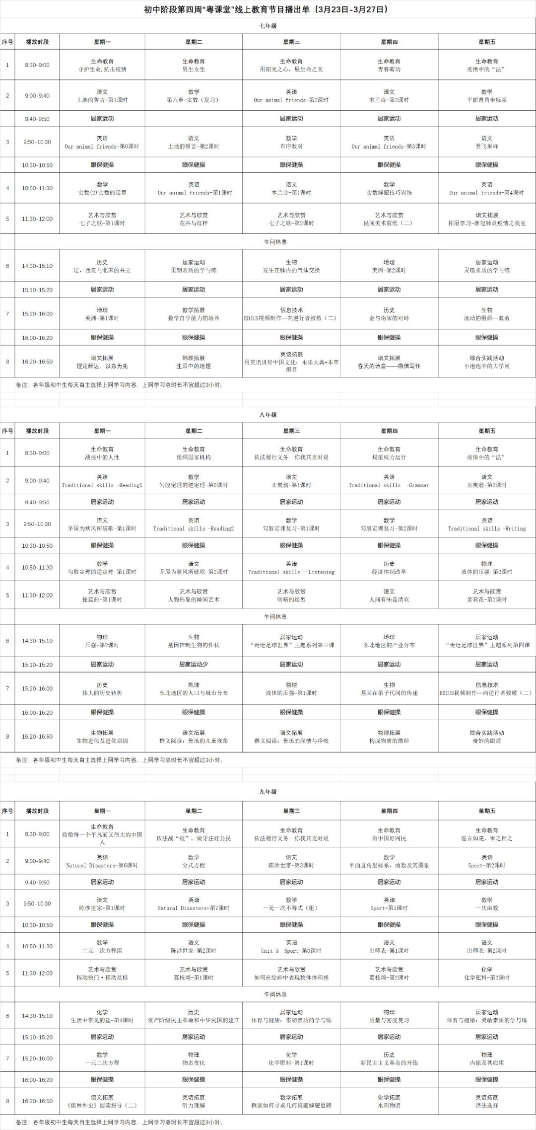 初中阶段第四周“粤课堂”线上教育节目播出单(3月23日-3月27日)