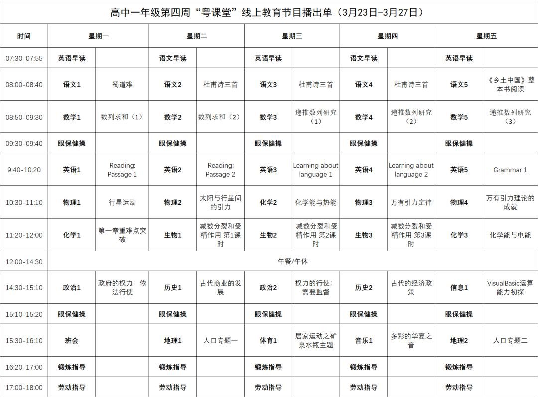 高中一年级第四周“粤课堂”线上教育节目播出单(3月23日-3月27日)