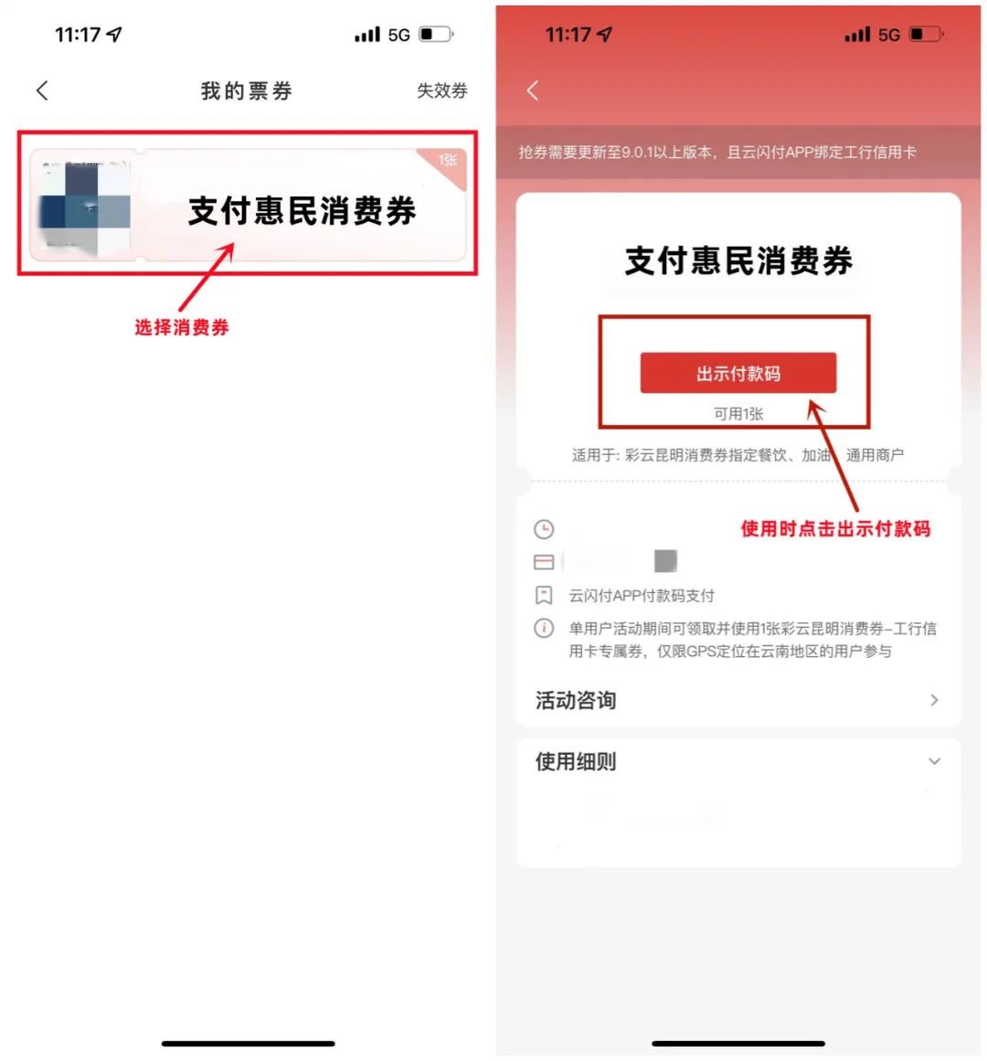 核券时请注意:出示付款码付款时请注意票券所属银行,需要选择与票券归属银行一致的相关银行卡进行支付,否则将出现无法享受优惠的情况。