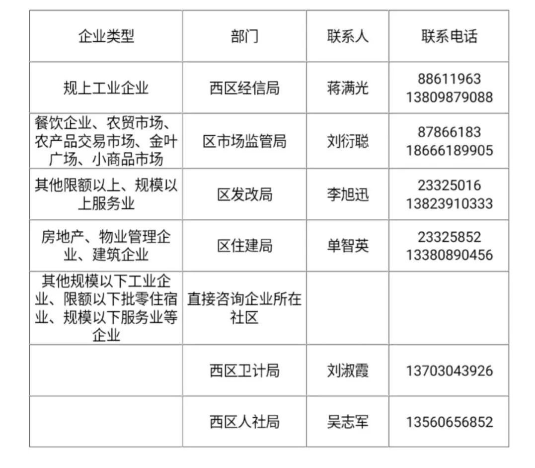 企业复工复产联系人名单