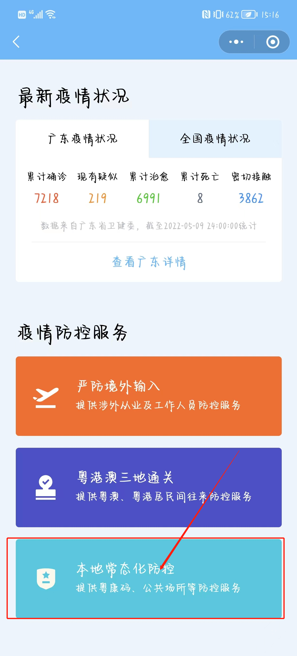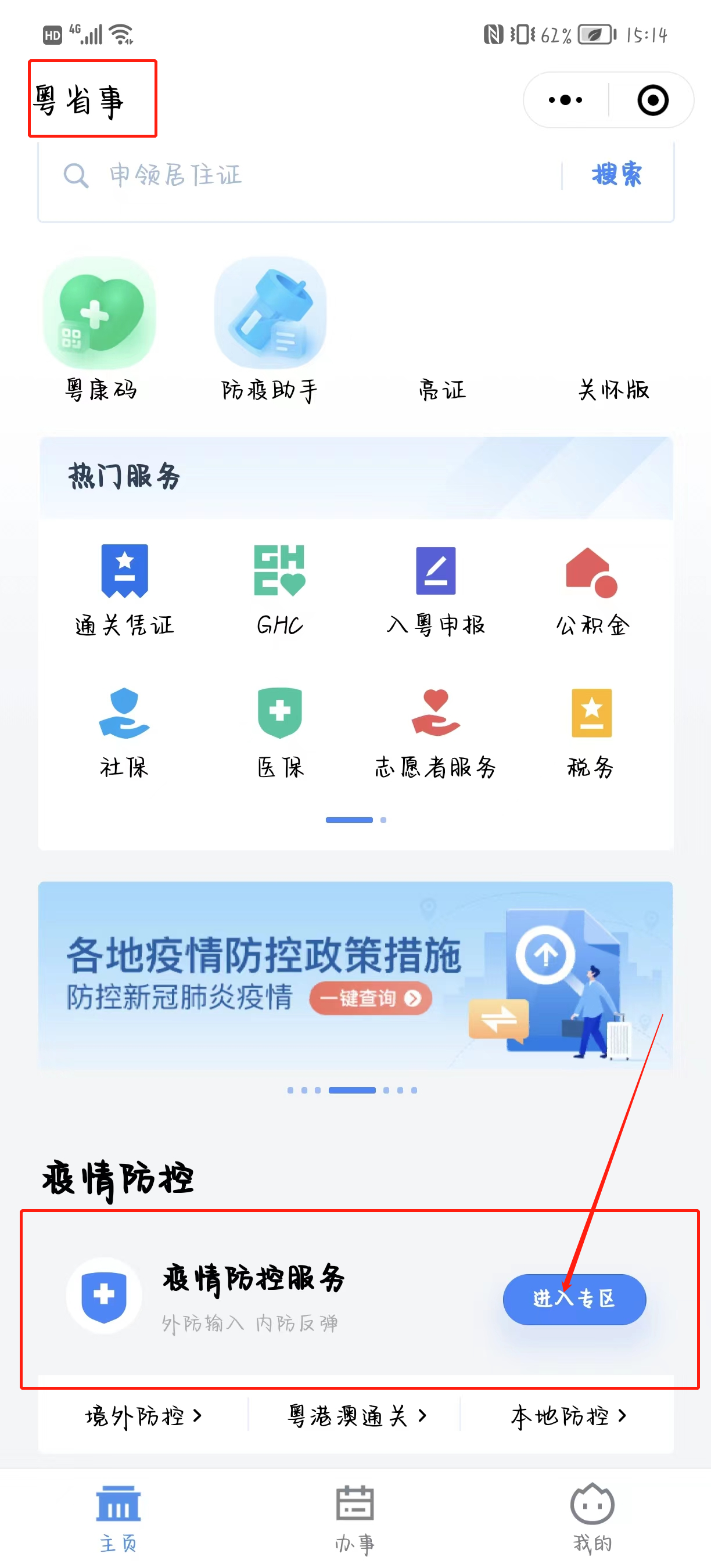 2、在微信搜索“粤省事”小程序,进入“疫情防控服务专区”;