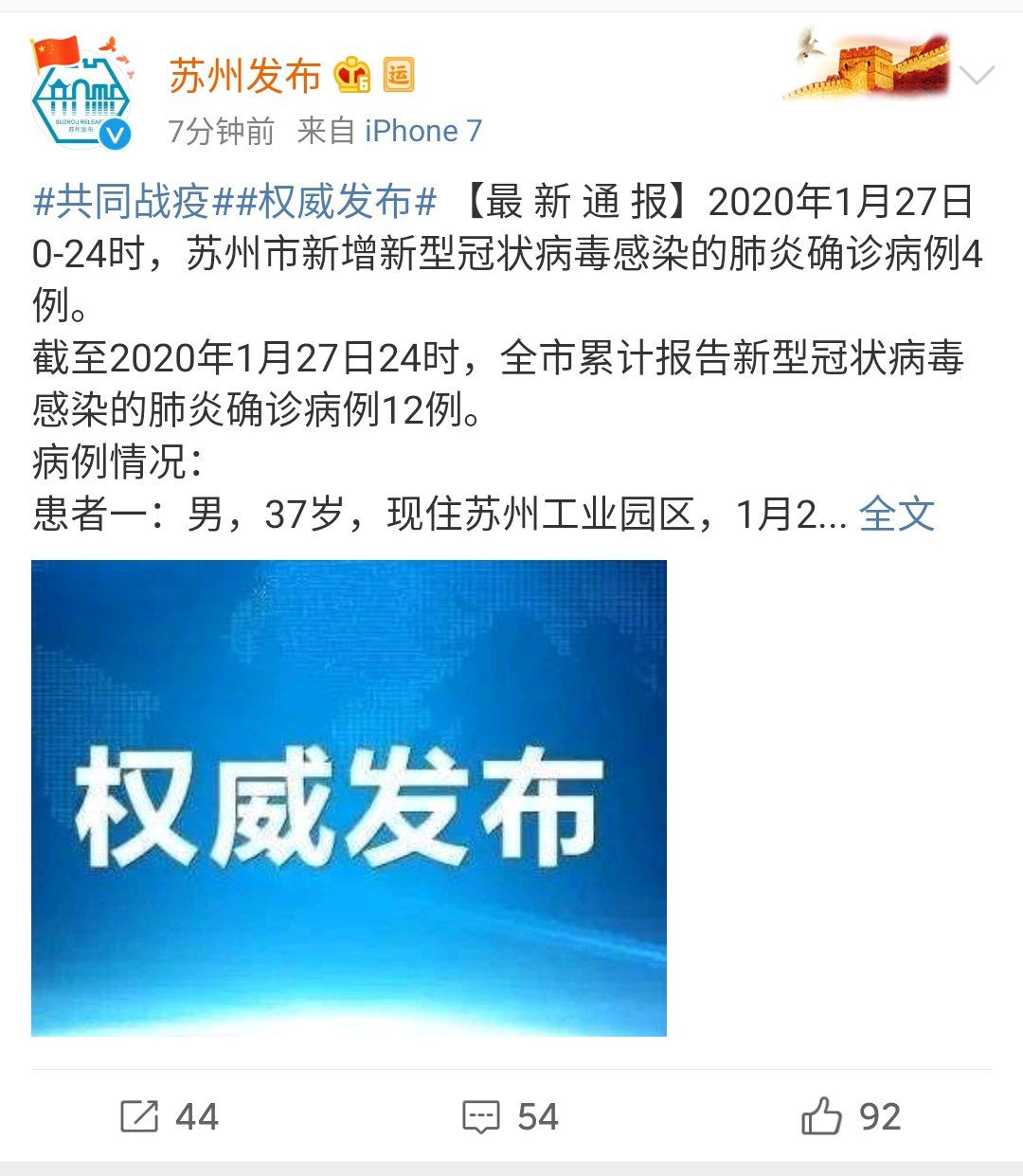 2020年1月27日0-24时,苏州市新增新型冠状病毒感染的肺炎确诊病例4例。