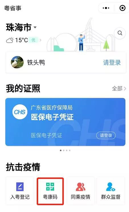 步骤1:由上述进入申领入口,即“粤省事”小程序,点击【粤康码】