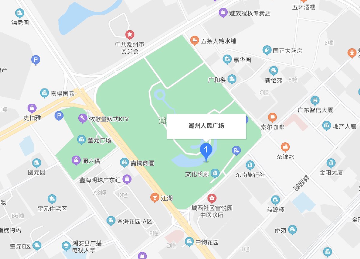 具体地址:潮州市湘桥区福安路与新泰街交叉路口往西约50米(人民广场-潮州人民广场喷泉东南侧)