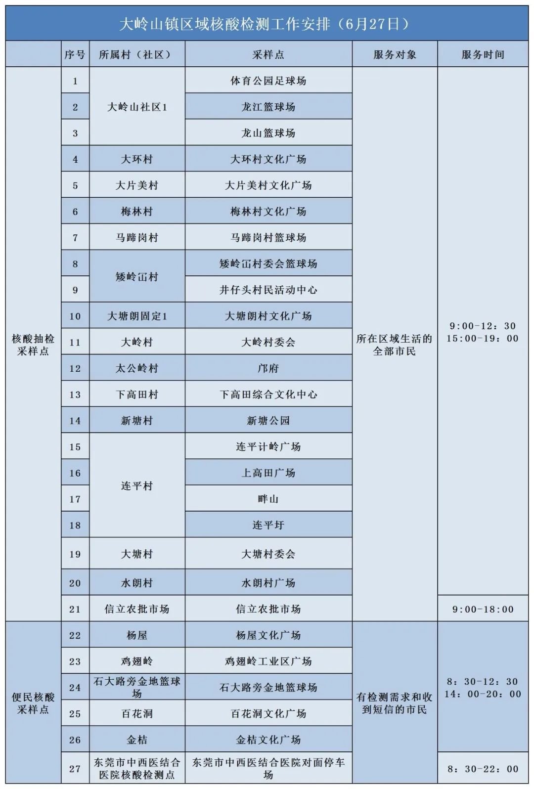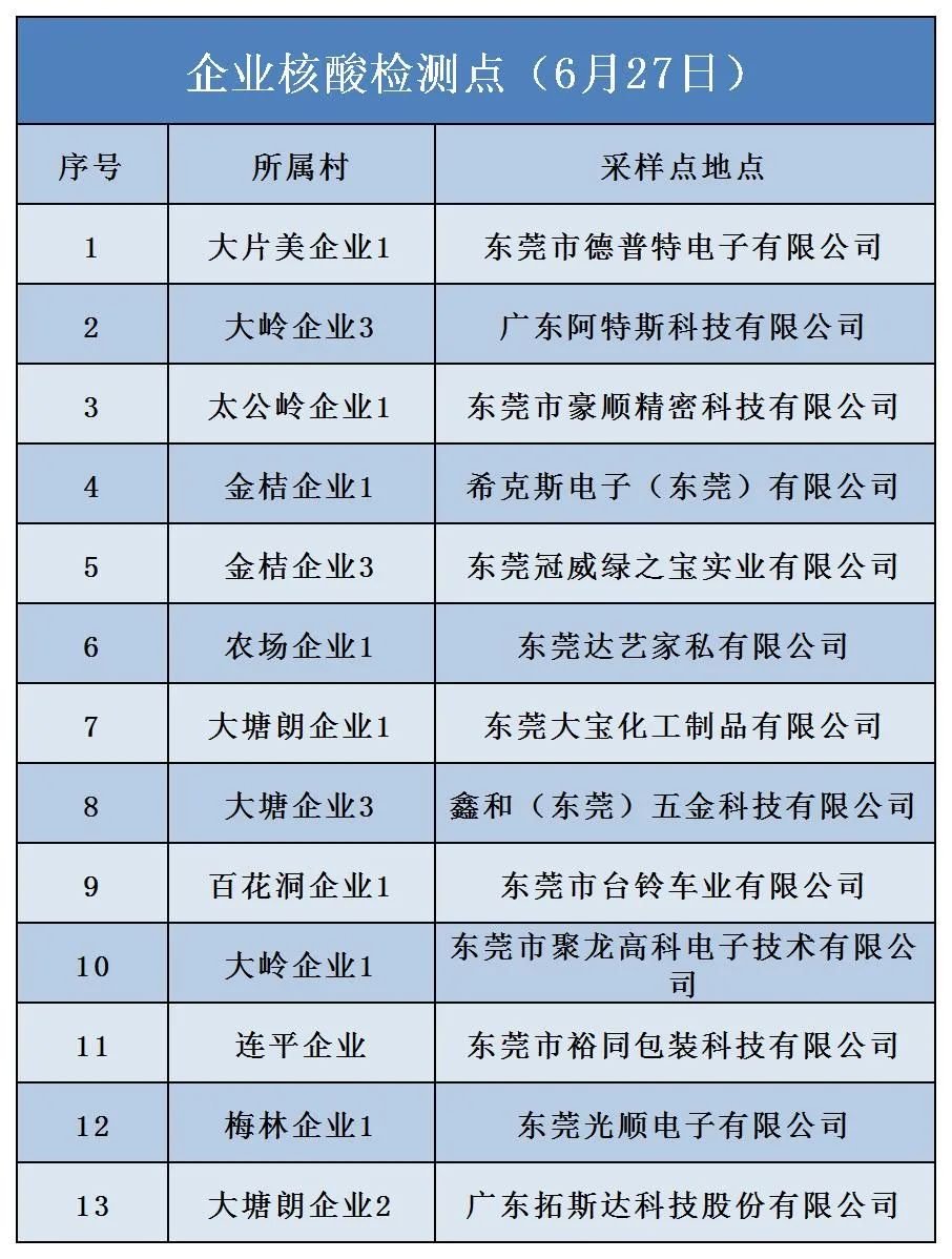 6月27日,免费开展区域核酸检测采样时间及核酸检测采样点: