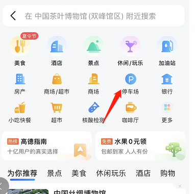 打开高德APP,搜索“中国茶叶博物馆双峰馆”,然后,点击下方的“周边”,进入下一页面后,点击“停车场”即可获取周边停车场推荐。