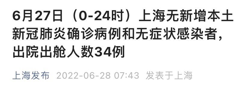 上海市卫健委6月28日通报:2022年6月27日0—24时,无新增本土新冠肺炎确诊病例和无症状感染者。新增境外输入性新冠肺炎确诊病例3例和无症状感染者6例,均在闭环管控中发现。