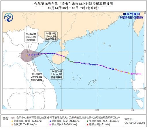 今年第16号台风“浪卡”(热带风暴级)的中心今天(14日)上午10点钟位于越南清化市偏东方大约150公里的北部湾海面上,就是北纬19.6度、东经107.2度,中心附近最大风力有9级(23米/秒),中心最低气压为990百帕,七级风圈半径200-250公里。
