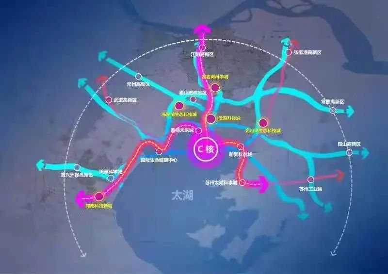 以太湖湾科创带为核心引擎,协同梁溪科技城、江阴霞客湾科学城、宜兴陶都科技城、锡山宛山湖生态科技城和惠山洗砚湖生态科技城,形成 “一带五点”的市域创新空间体系。