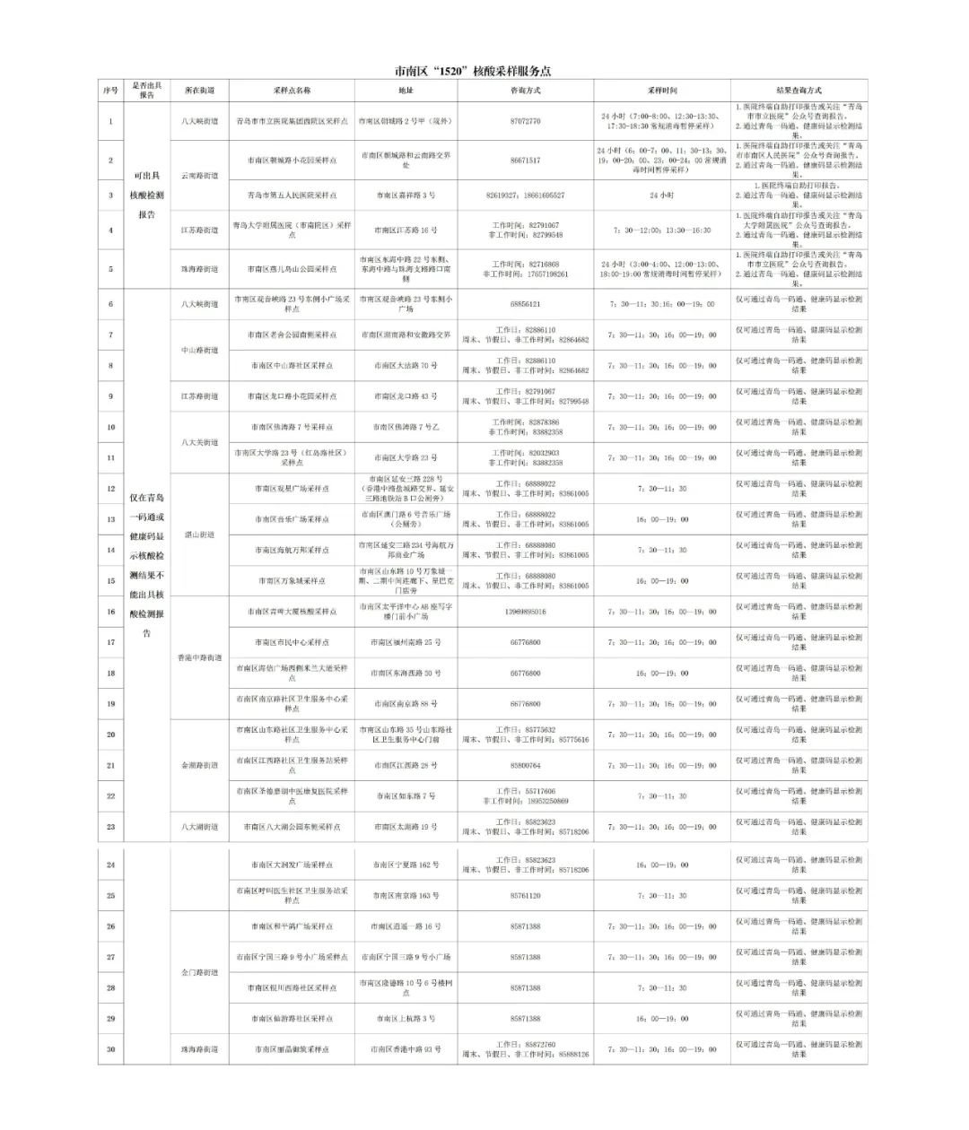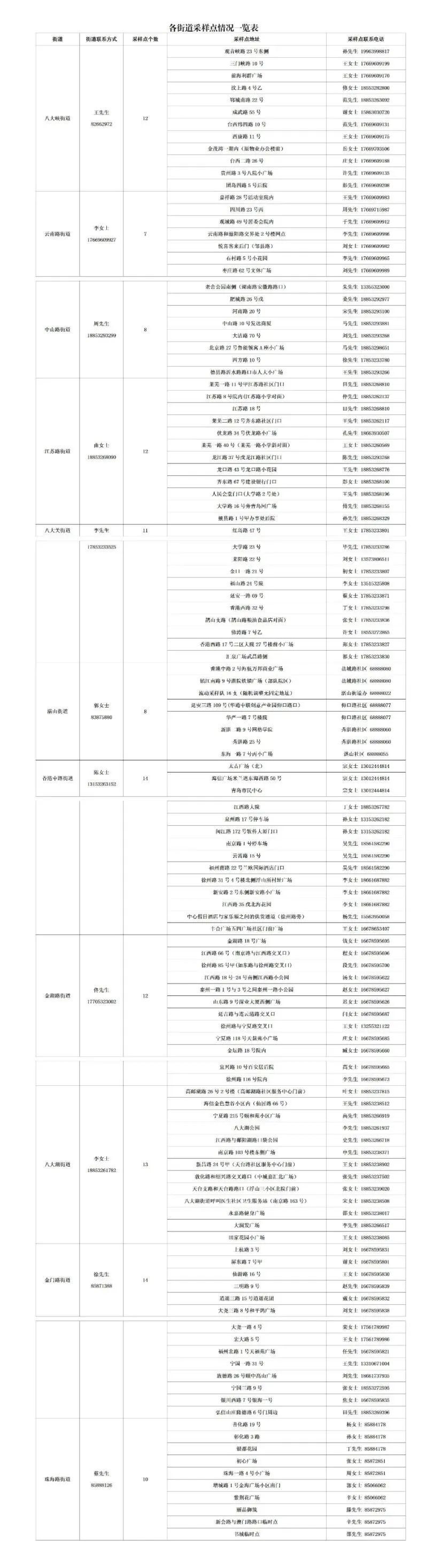 由各街道办事处统一安排采样点,具体信息详见采样点情况一览表(附后),或是扫描“市南区核酸检测采样点地图小程序”(附后),对核酸检测采样点进行查询。