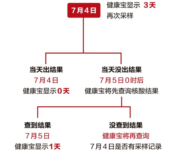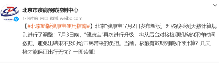 北京“健康宝”7月2日发布新版,对核酸检测天数计算规则进行了调整;7月3日晚,“健康宝”再次进行升级,将从后台对接检测机构的采样时间数据,避免出结果不及时给市民带来的负担。