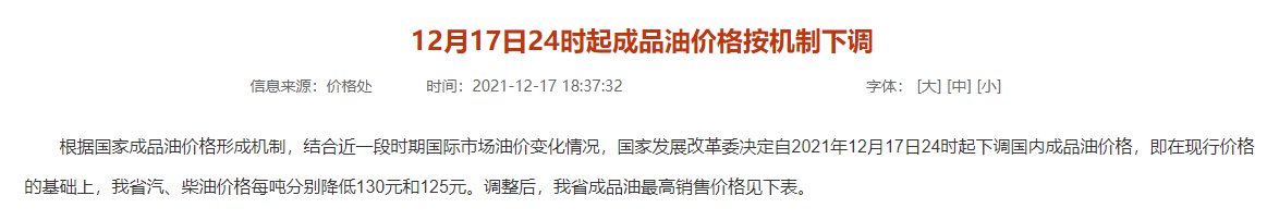 ➤油价调整时间:12月17日24时起成品油价格按机制下调