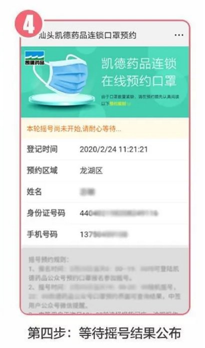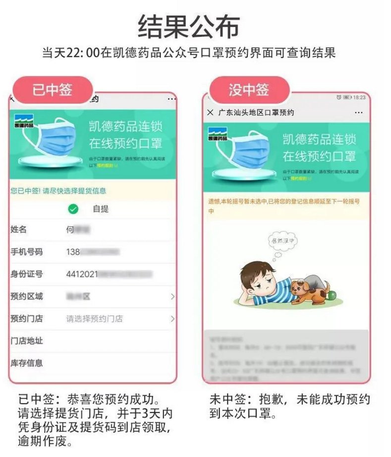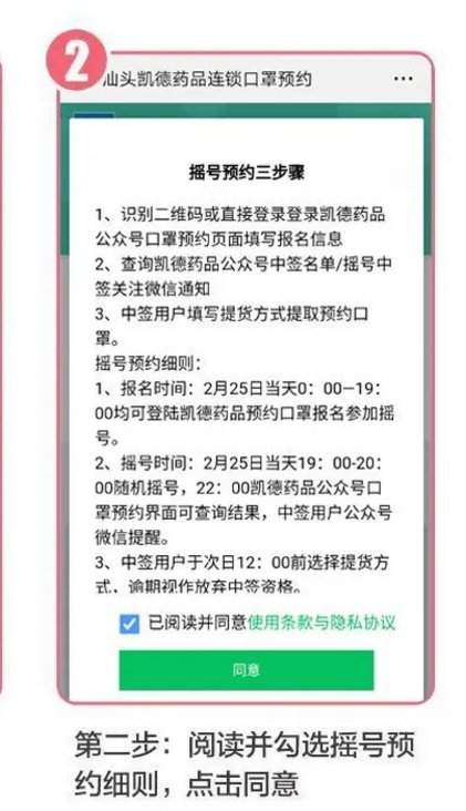 2、结果公布时间:3月11日19:00-20:00系统进行随机摇号,22:00开始可在凯德药品公众号预约口罩链接处查询结果,中签用户公众号会收到微信提醒。