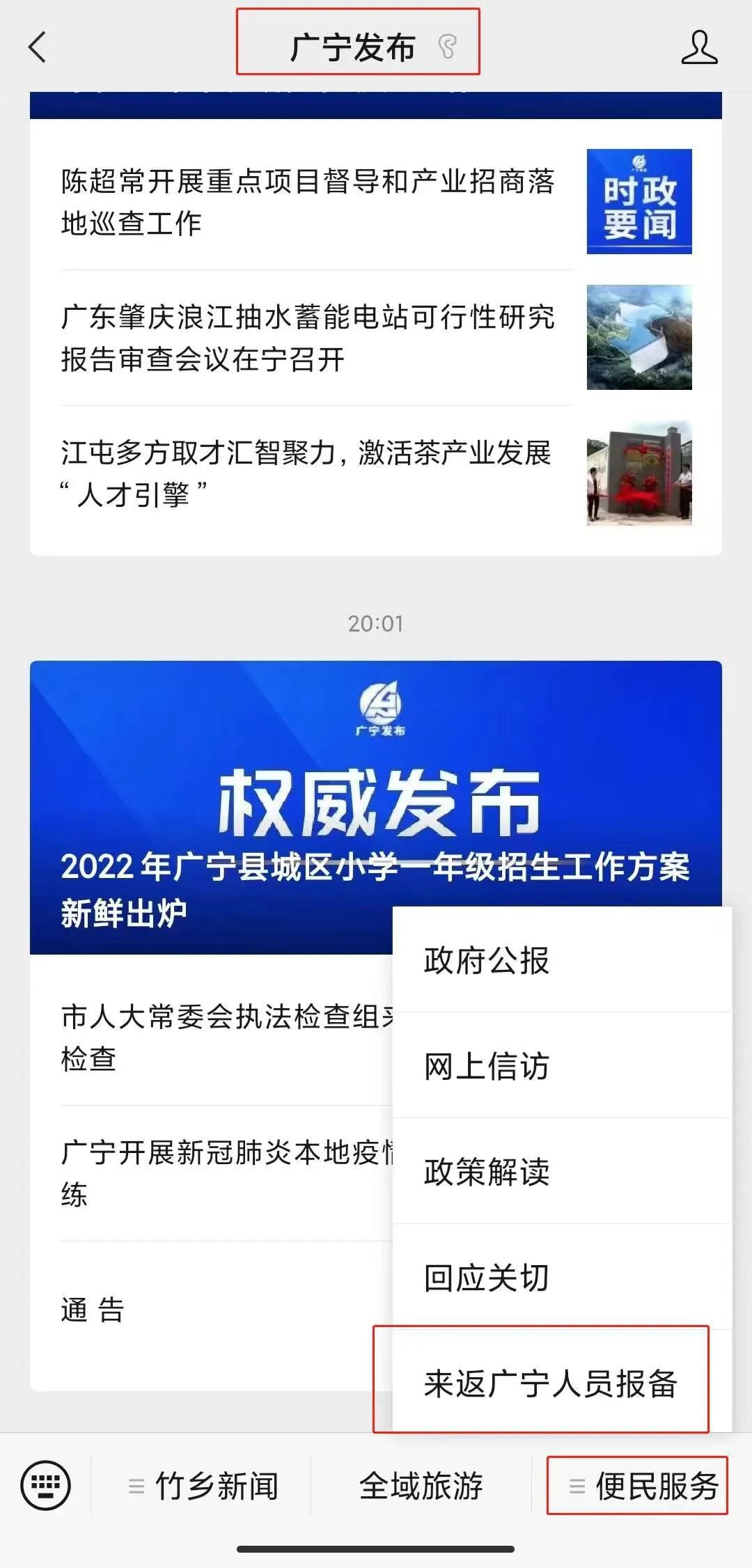 方式二:进入“广宁发布”公众号→点击“便民服务”菜单→来返广宁人员报备