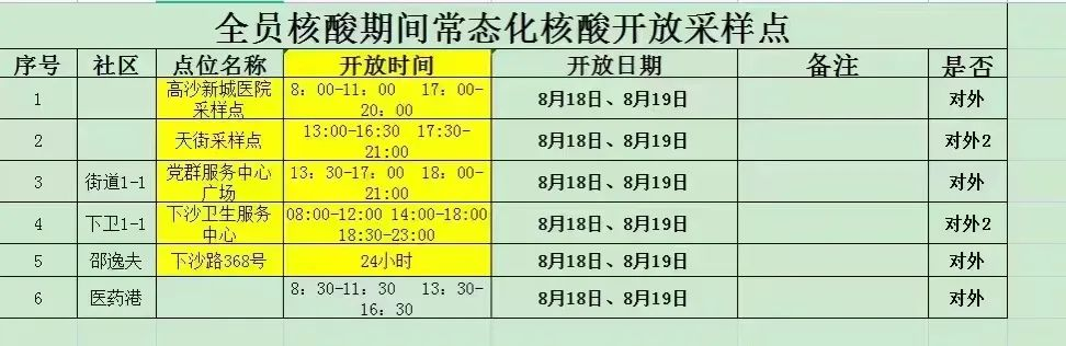 根据要求,从8月18日起,除以下6个点位以外,下沙街道所有常态化核酸点位全部关闭,以下是8月18日、8月19日开放的常态化核酸采样点信息。