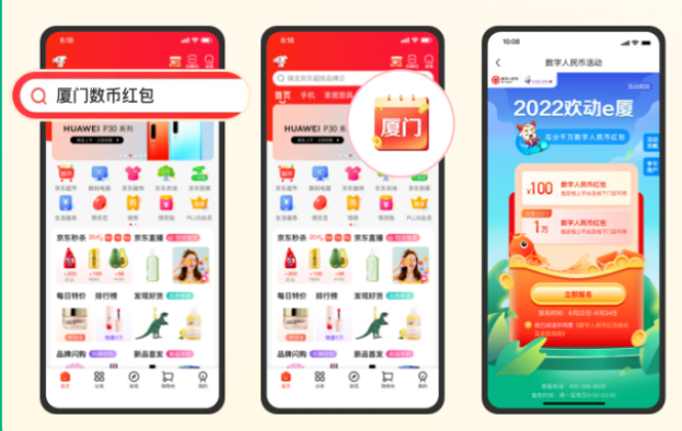 实时地理位置定位在厦门市的用户登录京东APP,首页搜索“厦门数币红包”、“2022欢动e厦”、“数字人民币”或点击首页右上角图标进入“2022欢动e厦”数字人民币红包活动专区,填写必要的信息,并选择数字人民币红包的发放运营机构(工商银行、农业银行、中国银行、建设银行、交通银行、邮储银行、招商银行),即可完成登记报名。