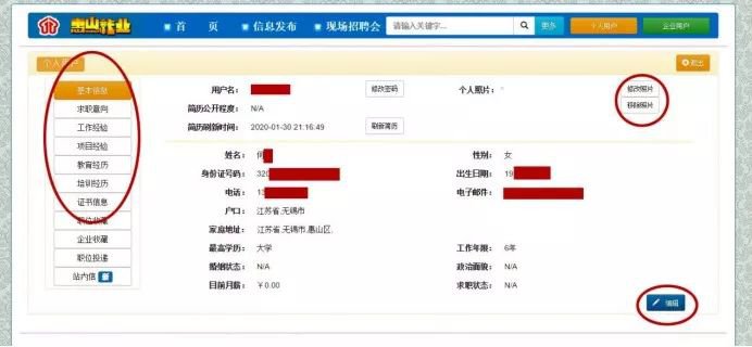 2、个人简历信息填写:点击左侧菜单栏“个人中心”,完善个人简历信息并保存。