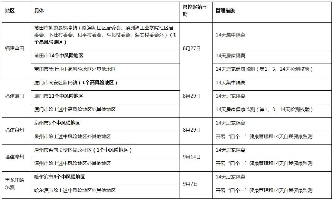9月23日,广东省疾病预防控制中心官网发布对重点地区来(返)粤人员健康管理措施。截至当天11时,福建莆田、厦门、泉州、漳州和黑龙江哈尔滨等地重点地区来(返)粤人员要执行相应健康管理措施。