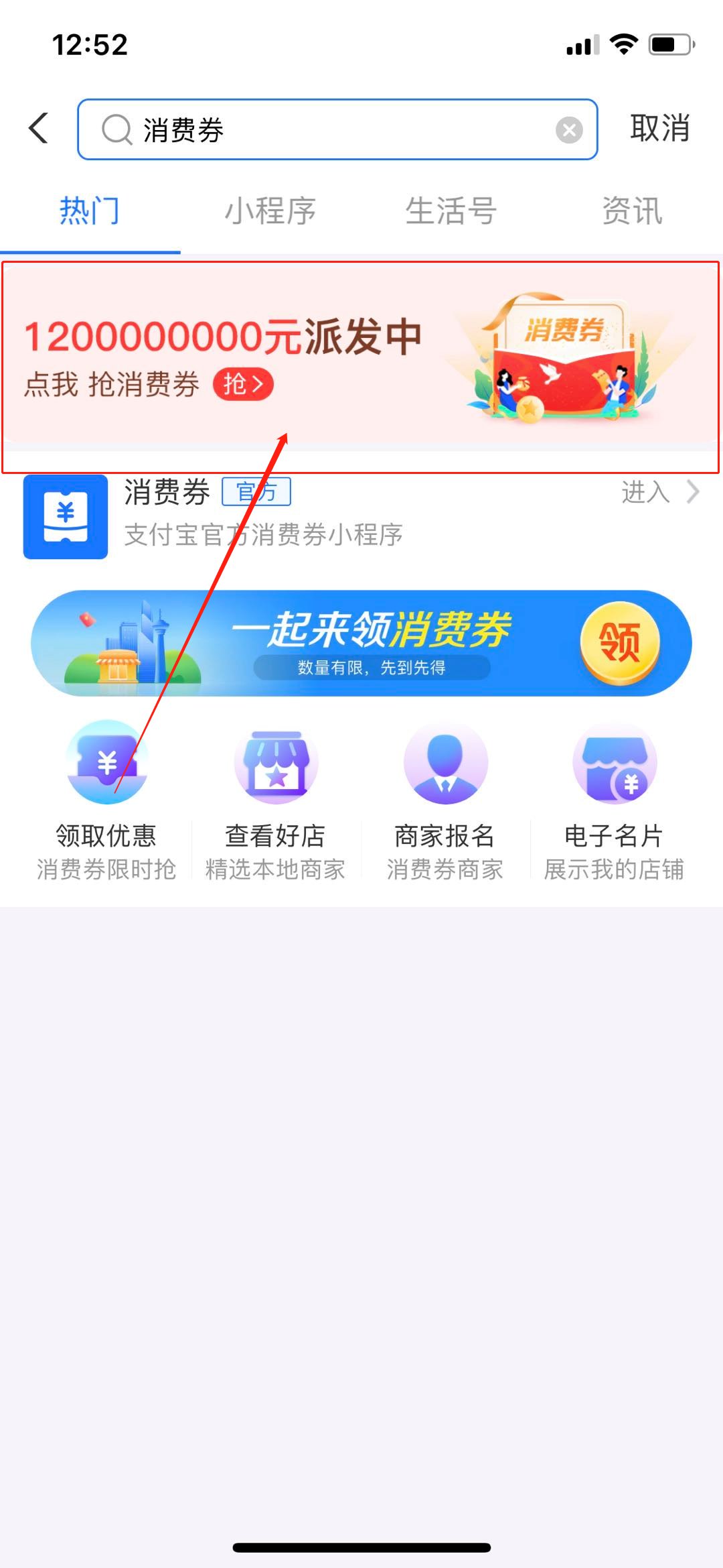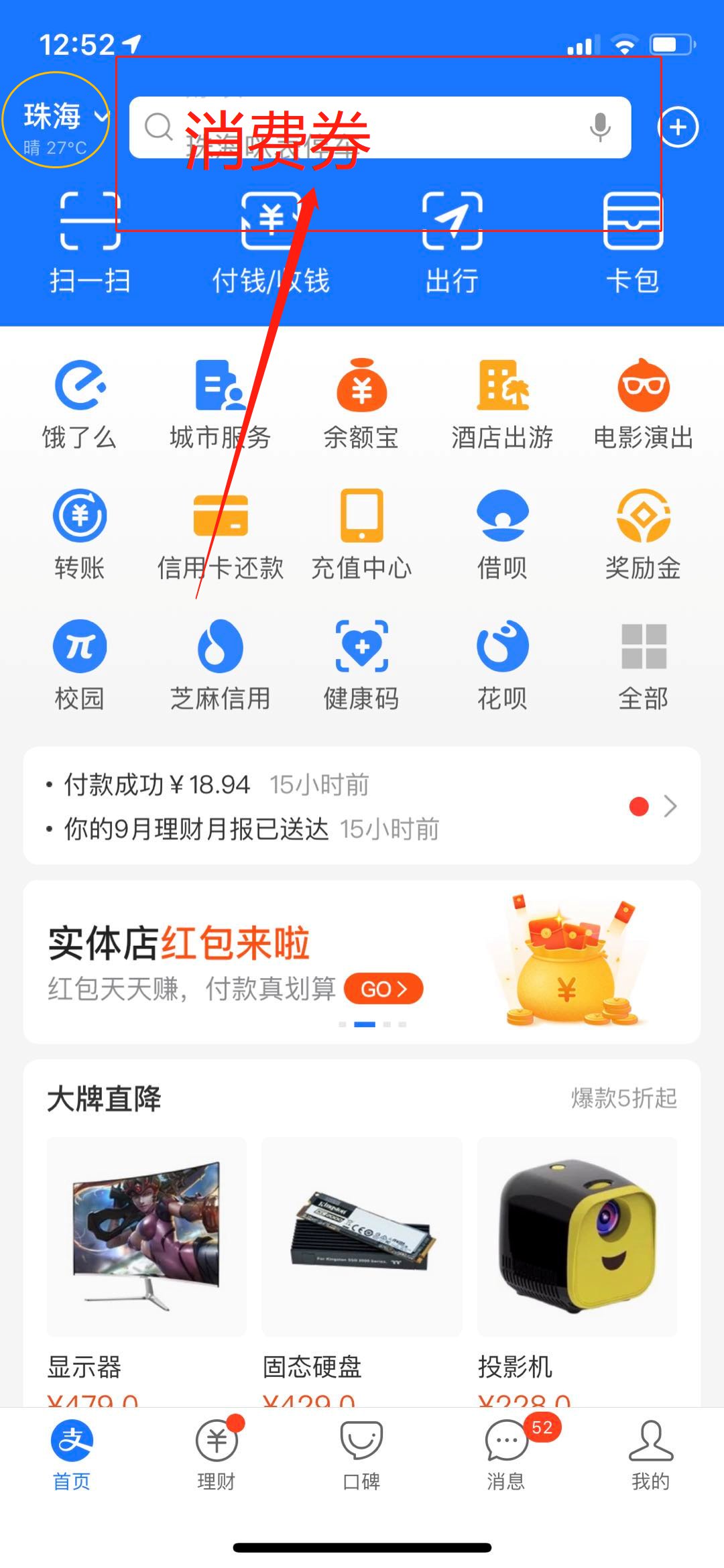 1.打开支付宝APP,在搜索框输入“消费券”(城市记得切换为珠海)