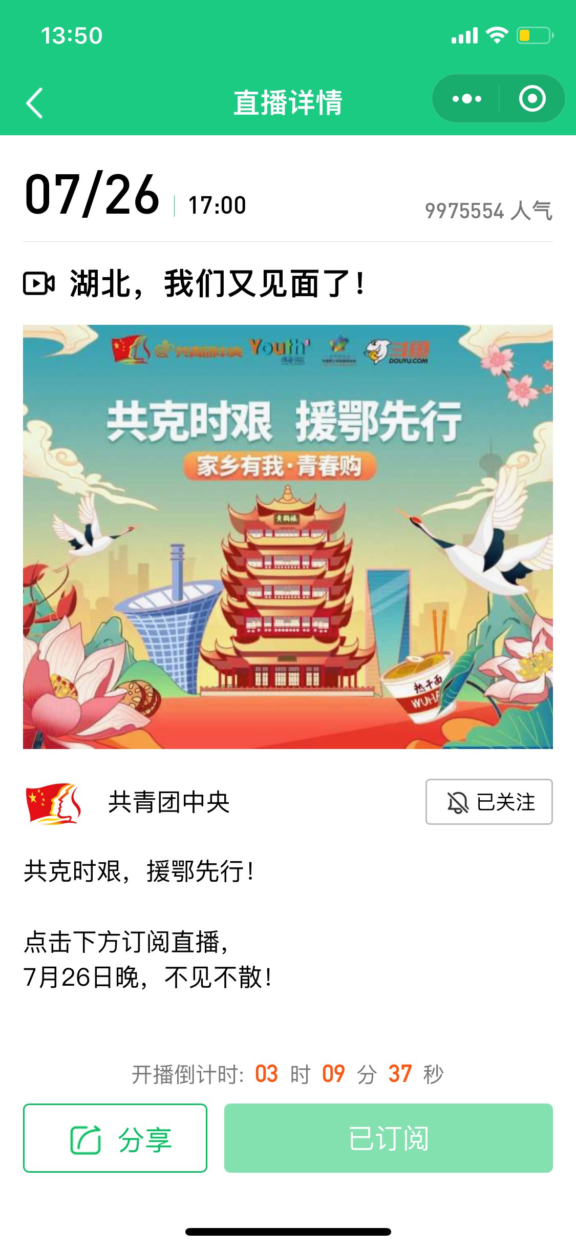 团中央和斗鱼直播联合开展的“共克时艰 援鄂先行”——家乡有我·青春购,于2020年7月26日17:00正式开始啦!