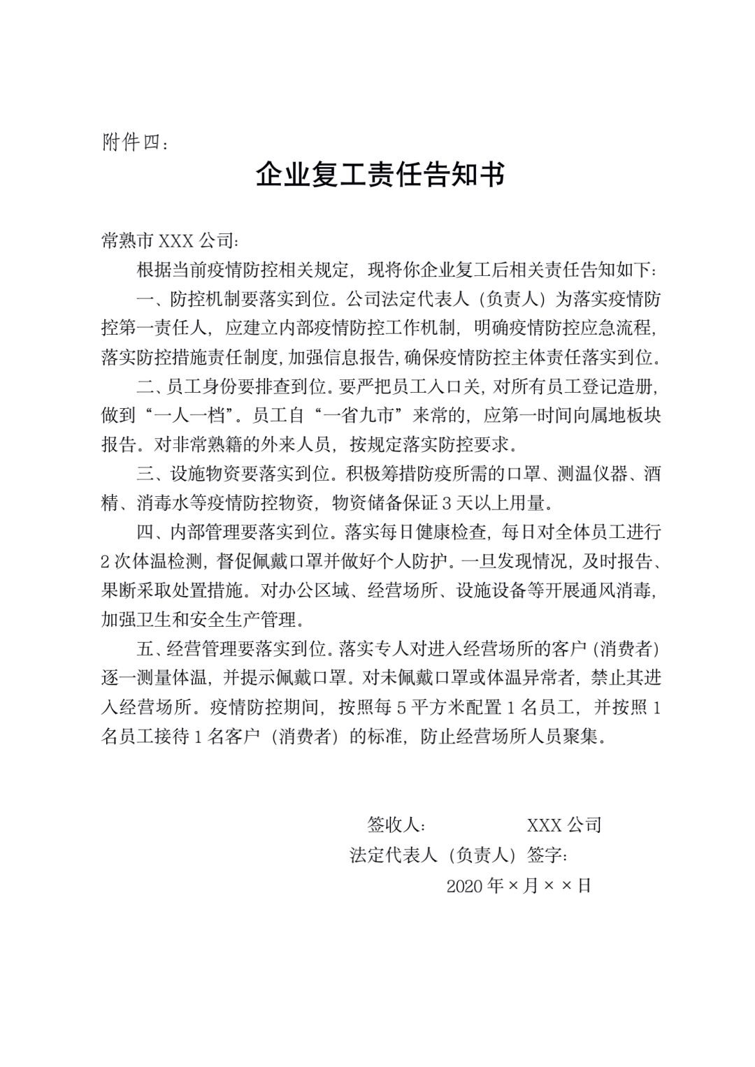 企业法定代表人(负责人)应签收复工《责任告知书》,提交经签字并加盖企业公章的《责任告知书》。