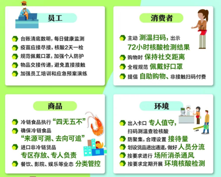 提醒顾客购物时保持社交距离,规范戴好口罩;提倡顾客自助购物、非接触扫码付费;合理设置接待量,防止造成人员聚集;餐饮、影院、娱乐等按业态分类管控
