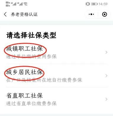 9、进入“养老资格认证”后,选择社保类型“城镇职工社保”或“城乡居民社保”。