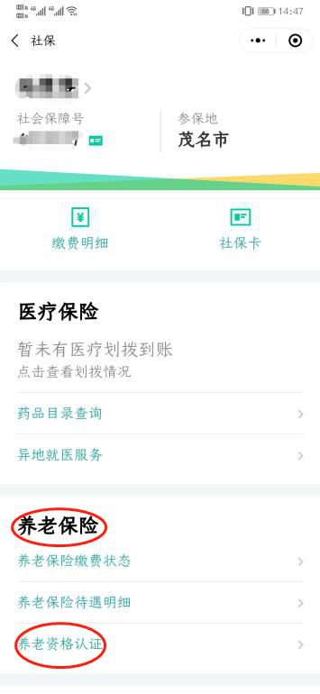 8、登录成功后会进入“社保”页面,点击选择“养老保险”中的“养老资格认证”。