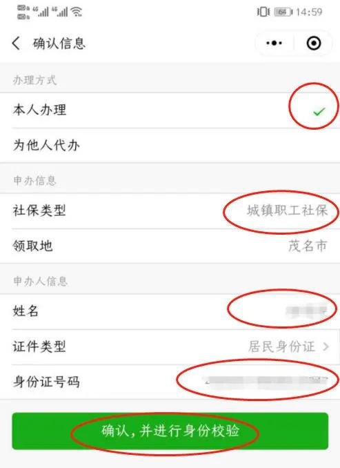 11、进入“确认信息”界面,选择“本人办理”,“社保类型”、“领取地”、“姓名”、“身份证号码”已自动默认前面操作已填写的,然后点击“确认,并进行身份校验”。