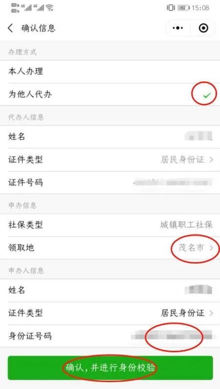 12、进入“确认信息”界面,如果是选择“为他人代办”,则要选择“领取地”为“茂名市”,填写申办人信息(姓名、身份证号码),点击“确认,并进行身份校验”后开始进行养老金领取资格认证。