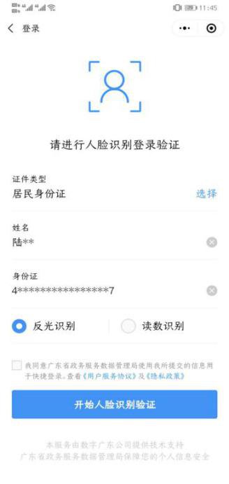 6、(1)如果是选择“人脸识别登录验证”,进入界面后要选择证件类型、填写姓名和证件号码(身份证号码),点击“反光识别”或“读数识别”,并在同意服务协议的□内选择打“√”,开始人脸识别验证,进入下一步“申请使用”界面。