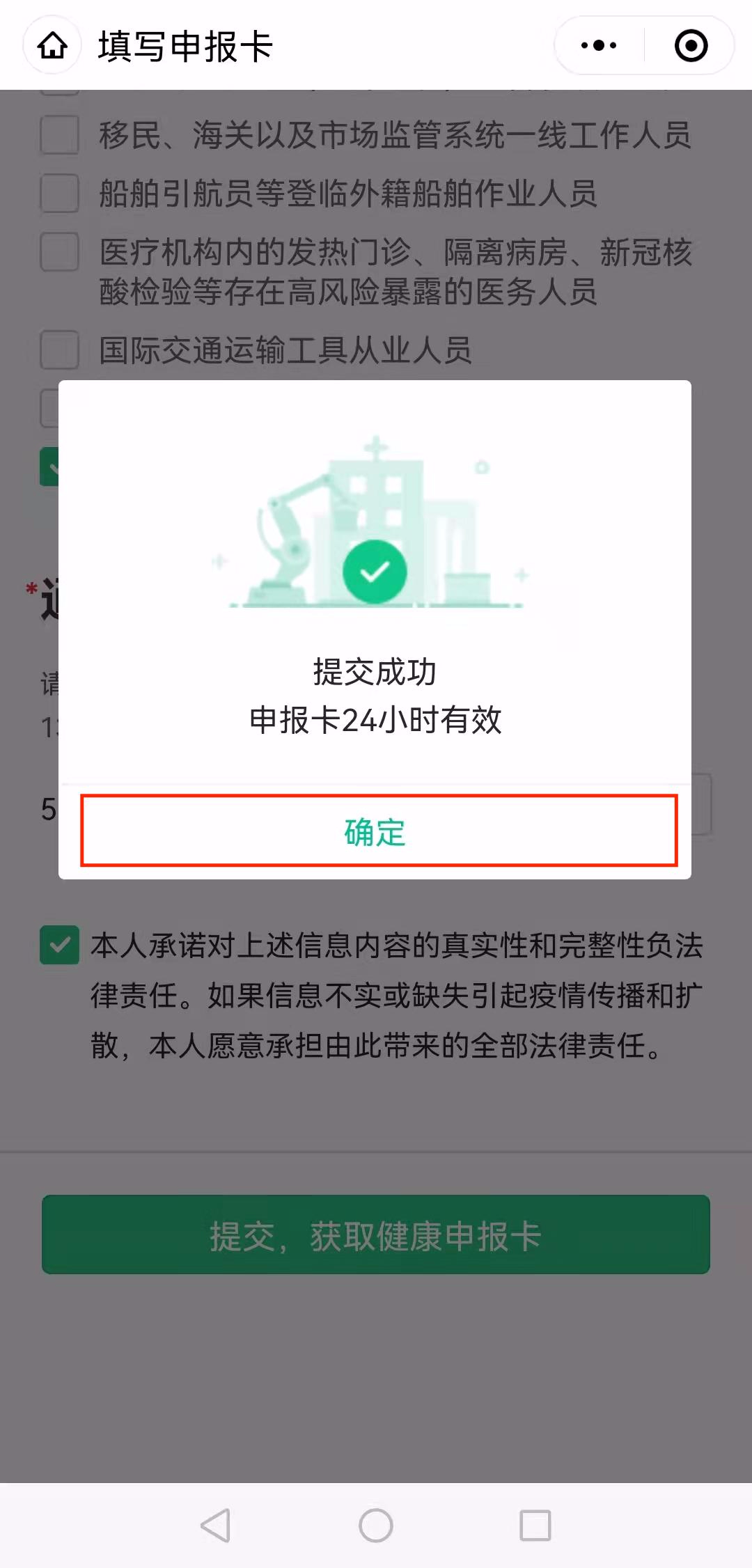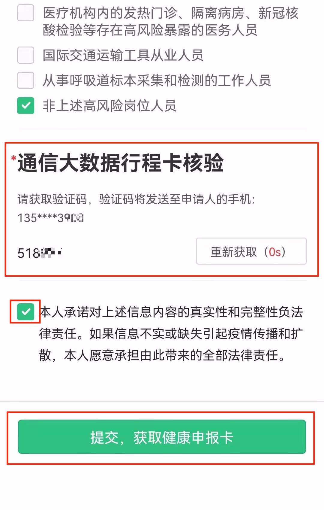 以上需要【获取验证码】,填写验证码后,打√,【提交,获取健康申报卡】