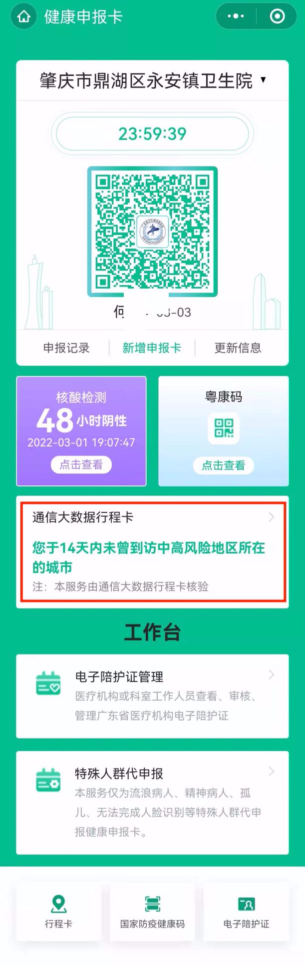 15、生成当日的健康申报卡,里面整合了核酸检测,粤康码,通信大数据行程卡等信息,无需要转换系统。