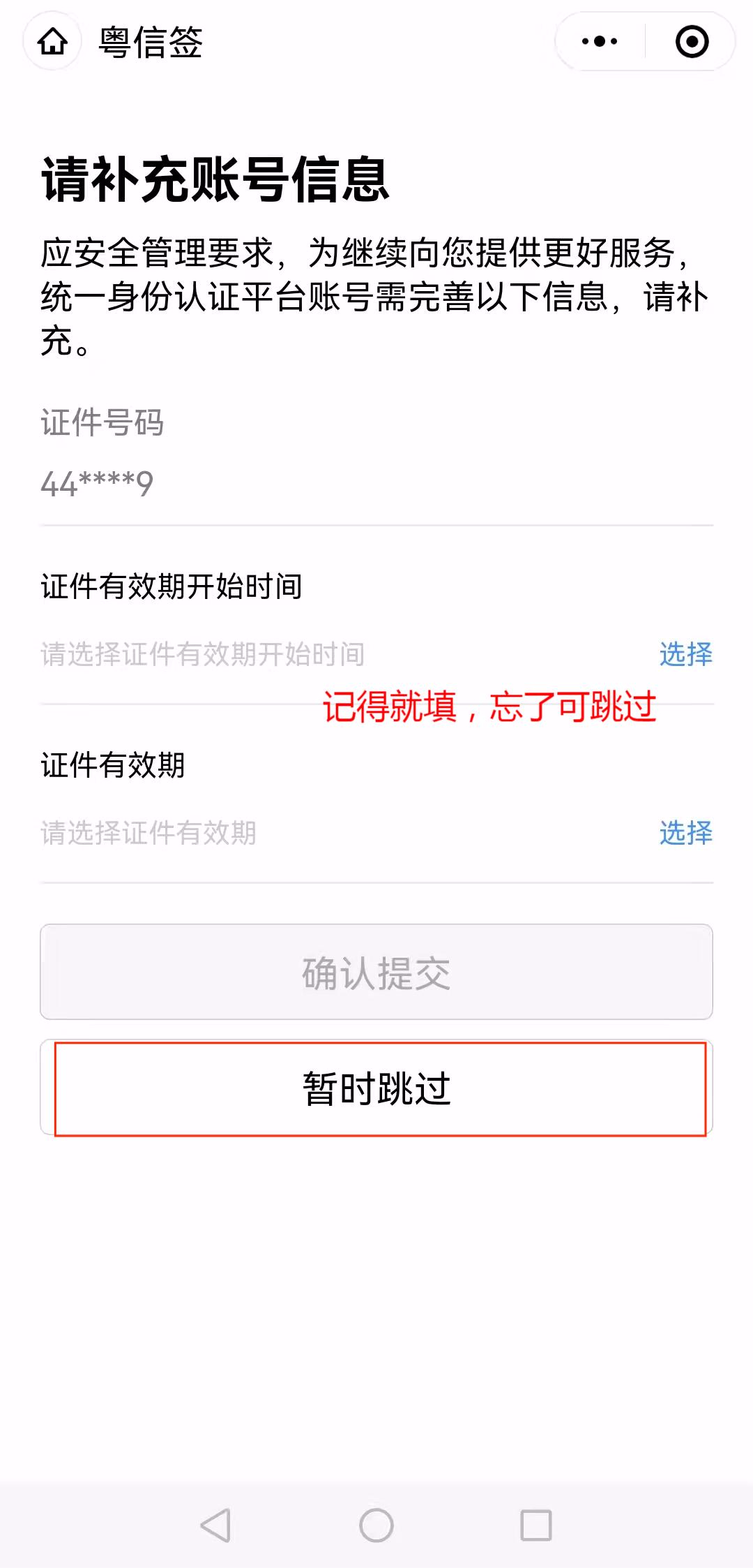 10、请补充账号信息,记得就填写【确认提交】,忘记了可以【暂时跳过】