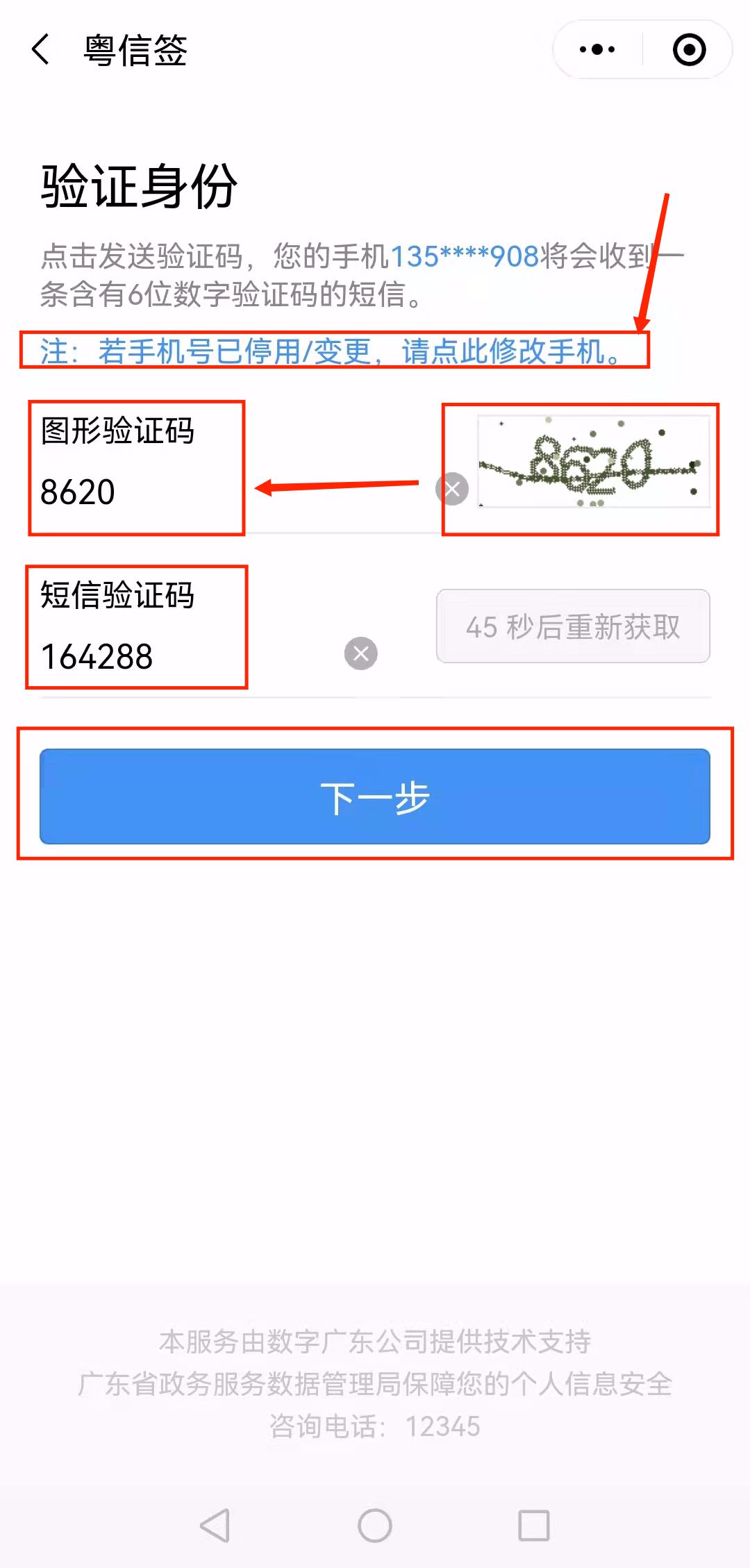 8、验证身份,若手机号停用/变更的,请在这里修改,确保可以接收验证码。输入【图形验证码】,获取手机验证码后输入【短信验证码】,【下一步】
