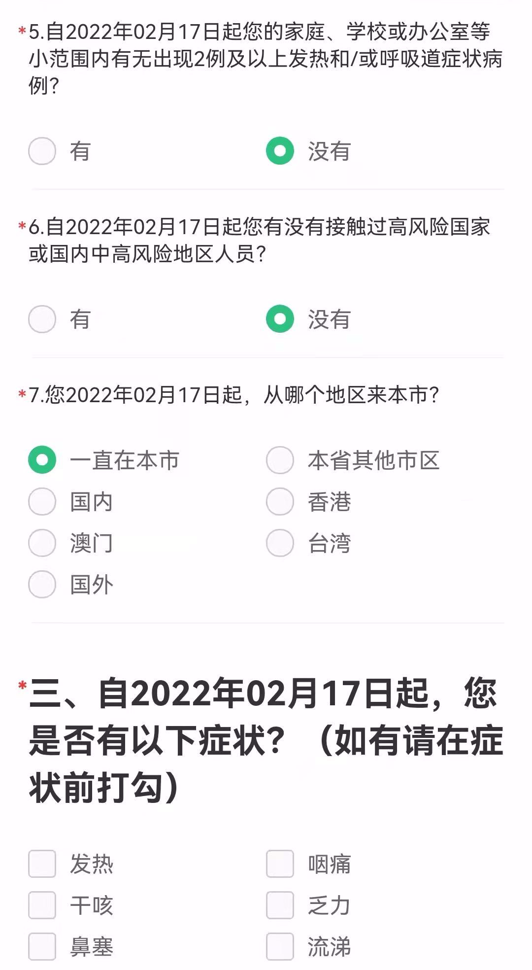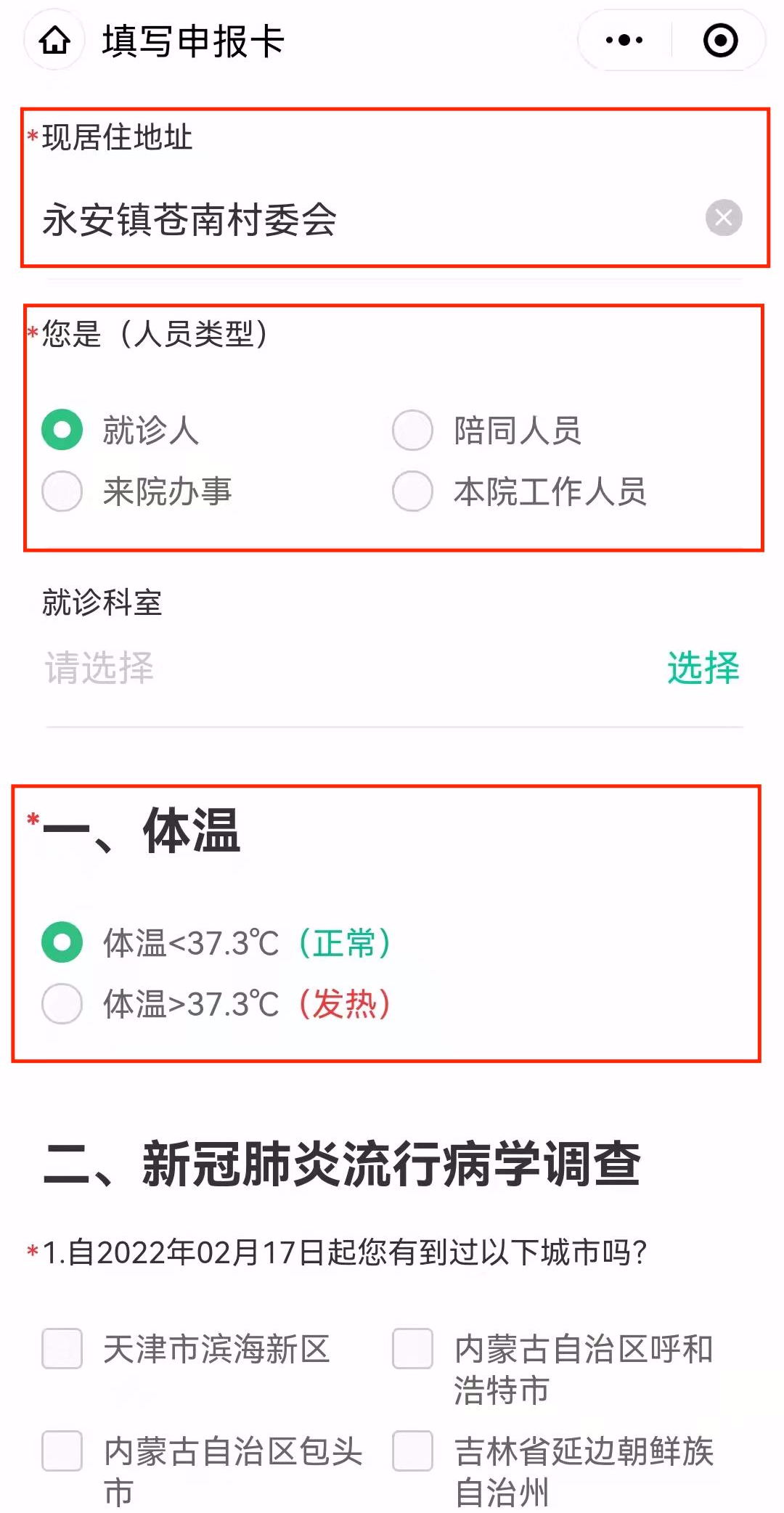 13、补充现住址,选择人员类型,体温 ,如实填写选项