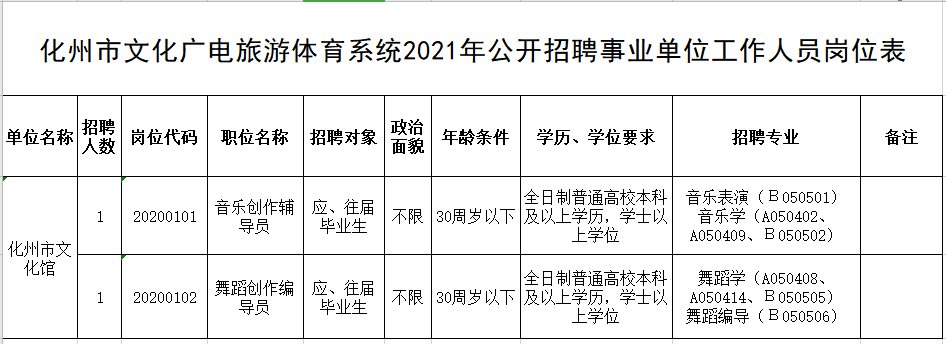 化州市文化广电旅游体育局属下公益一类事业单位工作人员2名。具体职位及要求见《化州市文化广电旅游体育系统2021年公开招聘事业单位工作人员岗位表》