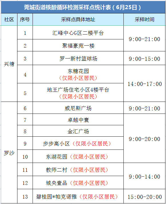 根据疫情防控工作需要,为充分发挥核酸检测的“排雷兵”作用和监测预警作用,自6月25日起,莞城街道开展新冠病毒核酸循环检测工作,6月25日检测的区域是兴塘社区和罗沙社区,其余社区将陆续开展,现将有关事项通告如下: