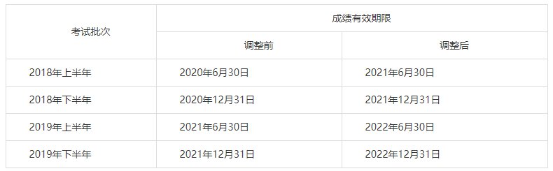 参加“2018年上半年至2019年下半年”各批次笔试,已通过的单科笔试科目成绩有效期延长1年,即成绩有效期由2年延长至3年,成绩查询网站页面会及时更新有效期限。