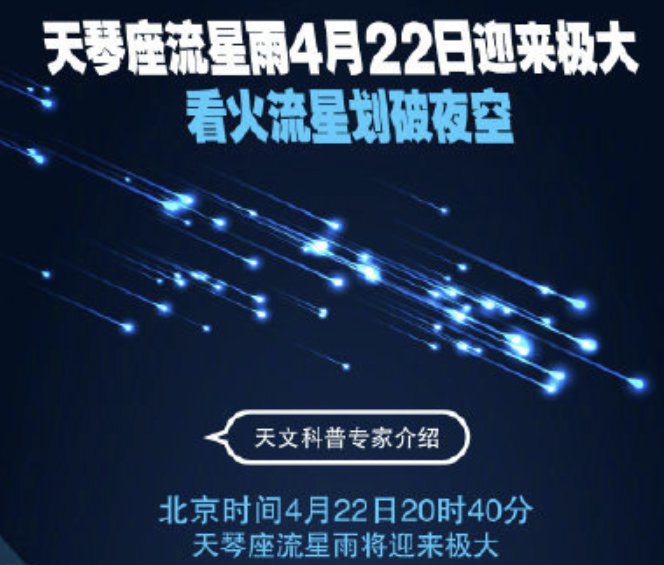 天文科普专家介绍,北京时间4月22日20时40分,天琴座流星雨将迎来极大,届时每小时会有一二十颗流星划过天空。如果天色晴朗,我国乃至北半球各地,都可目睹到该流星雨“绽放”夜空的美妙场景。