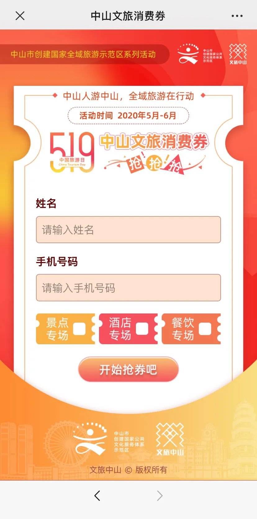 今年的5月19日是第十个中国旅游日,由中山市文化广电旅游局主办的“中山人游中山,全域旅游在行动”5·19中国旅游日。中山文旅消费券主题活动第三轮抢券将于5月19日早上10时30分开始。