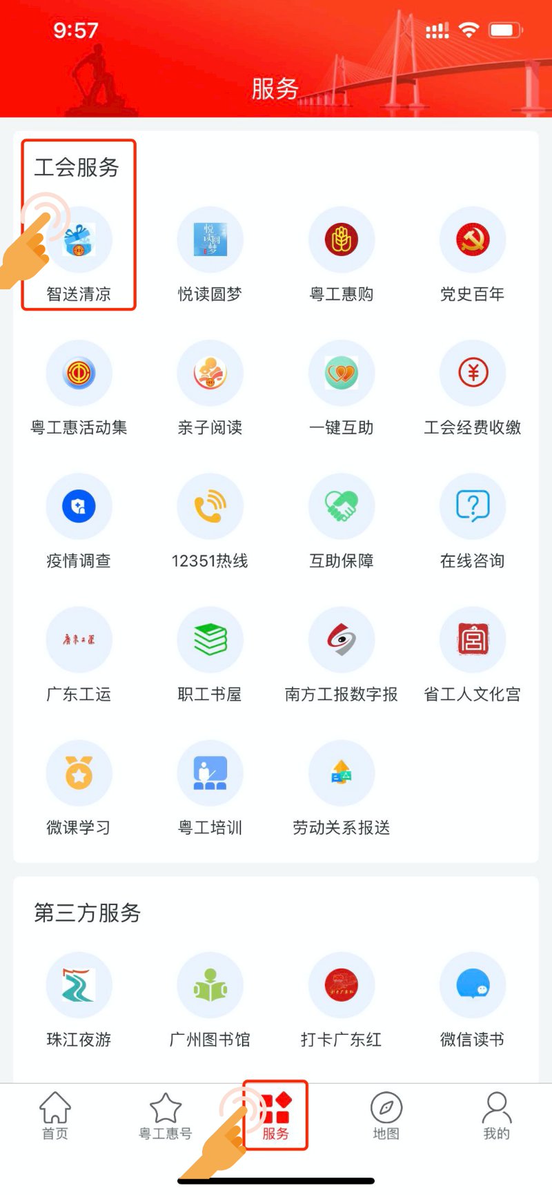 1、登录“粤工惠” App,进入工会服务,选择“智送清凉”活动按钮;