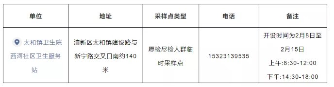 清新区防控办统筹部署,在太和镇城北广场西河社区卫生服务站新增设“愿检尽检”人群临时核酸采样点,自费做核酸检测的群众可自由选择临时采样点或医疗机构采样点进行采样,具体信息如下: