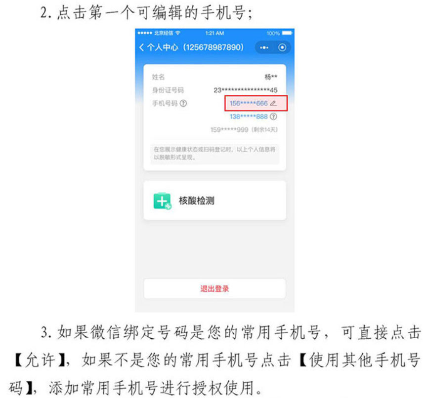 如果您分别使用过微信端及支付宝端的北京“健康宝”小程序,并均授权绑定过手机号码,则两端的手机号将都会显示在您的“个人中心”界面中。在您进行7天行程申报时,您“个人中心”中显示的所有手机号均需完成行程信息申报与核验。