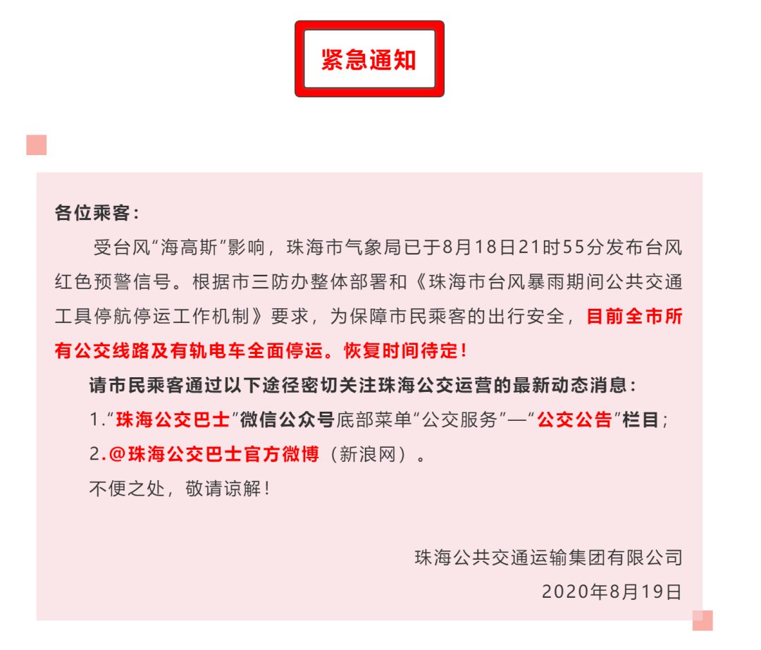 【斗门区、高栏港区暴雨红色预警信号】珠海市气象局8月19日07时40分发布,受“海高斯”影响,过去3小时斗门区和高栏港区降雨量已经接近或达到100毫米,预计强降雨仍将持续,市气象局已将斗门区、高栏港区暴雨预警信号升级为红色,其余区域暴雨橙色和全市台风红色预警信号继续生效。预计今天中午前狂风暴雨仍将持续,请继续做好防御工作。