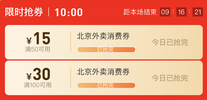 1.美团外卖消费券:满50-15元,满100-30元各一张;