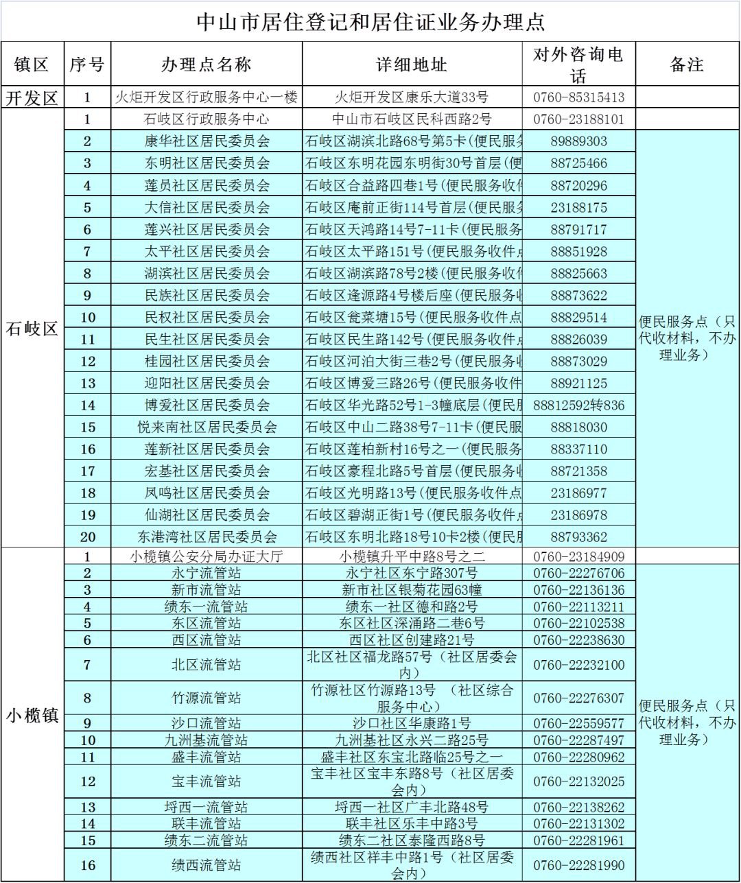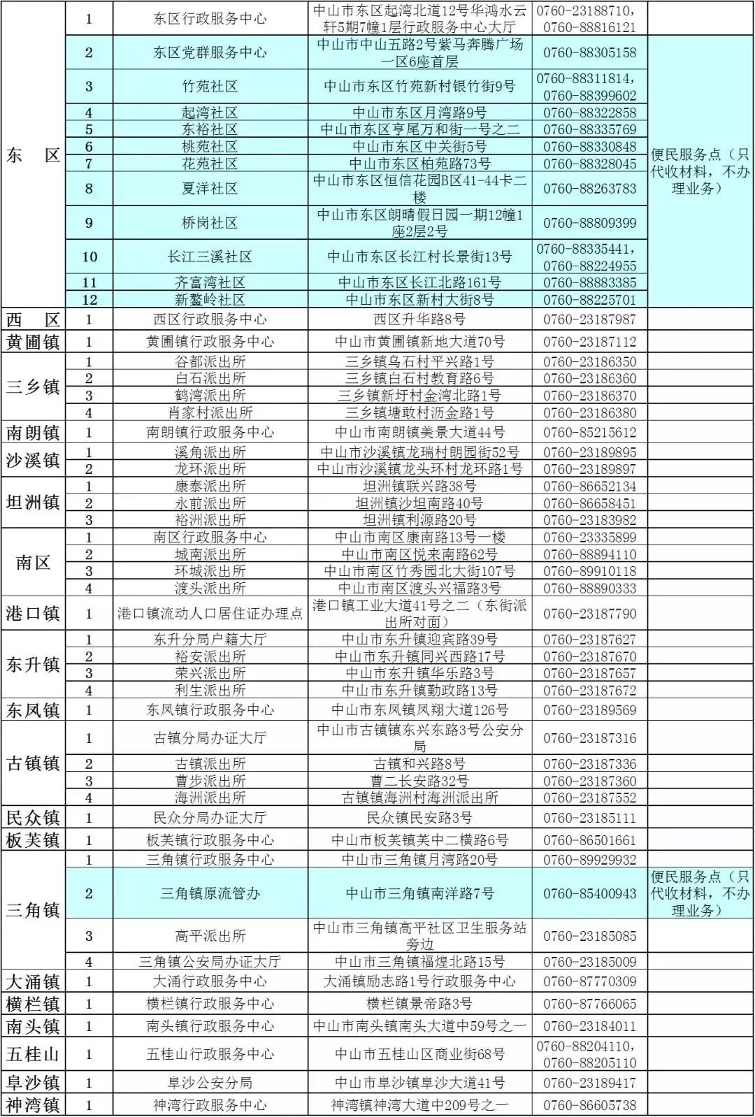 中山市各镇区流动人口管理办公室地址及咨询电话: