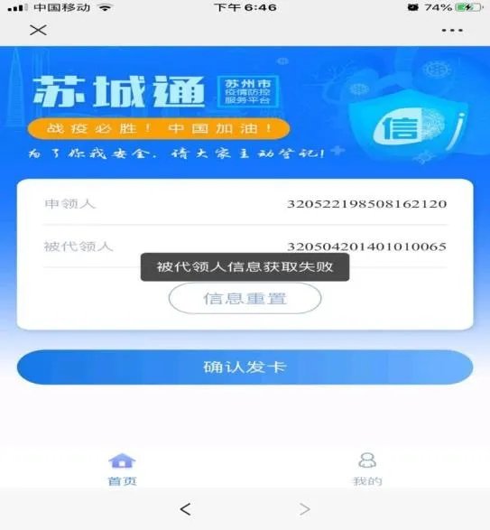 (2)操作不规范。注意:系统只默认通过“家人代办”方式取得的“苏城码”电子绿码的申请人和被代领人的身份证号,没有通过“家人代办”模块注册而采取直接注册方式的系统将拒绝默认。