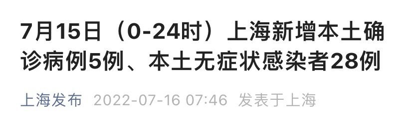 上海市卫健委7月16日通报:2022年7月15日0—24时,新增本土新冠肺炎确诊病例5例和无症状感染者28例,均在隔离管控中发现。